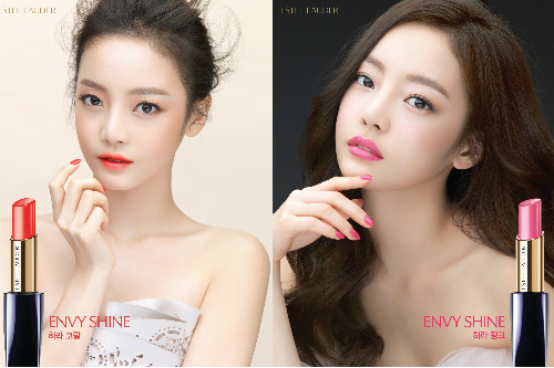에스티 로더는 핑크, 코랄, 체리 세 가지 립스틱 컬러의 구하라 메이크업 화보를 통해 신제품 엔비 샤인 립스틱을 소개했다.