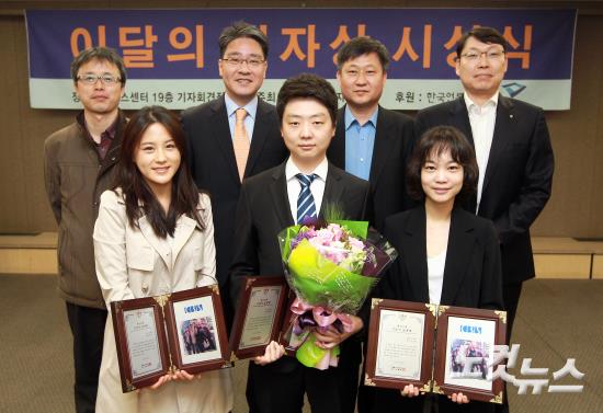 31일 오전 서울 태평로 프레스센터에서 열린 ‘제282회 이달의 기자상 시상식’에서 CBS 김연지(아랫줄 왼쪽부터), 김민재, 김지수 기자가 수상한 뒤 기념촬영 하고 있다. 한국기자협회는 282회 이달의 기자상 수상작으로 CBS 보도국 사회부 김연지, 김민재, 김지수 기자가 보도한 '여당 사무총장 아프리카 노동자 착취 논란' 등 모두 7편을 이달의 기자상으로 선정했다.