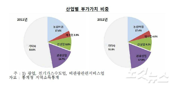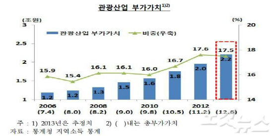 산업별 부가가치 비중에서도 2012년 관광산업이 17.6%로 농림어업 부가가치 17.4%를 추월했다.