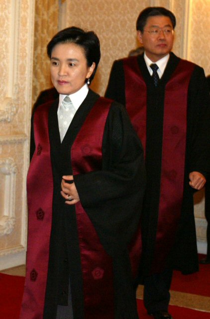 강금실 법무부장관이 1일 오전 과천종합청사 강당에서 열린 검사임관식에 참석, 김종빈 대검차장 등 간부들과 함께 식장에 입장하고 있다.(서울=연합뉴스)