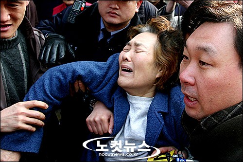 서울 용산구 용문시장의 한 신발가게에서 벌어진 초등학생 살해 사건을 수사하고 있는 용산경찰서가 20일 오후 용의자 김 모씨 부자를 대동, 2차 현장검장을 실시한 가운데 살해된 초등학교 4학년 허모양(11)의 할머니가 용의자들을 향해 오열하고 있다.