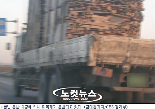 폐목재 운반은 모두가 불법으로 이뤄진 것이다. 먼저 관련법상 모든 폐기물을 수집 운반하는 차량은 ''폐기물수집운반증''을 부착해야한다.