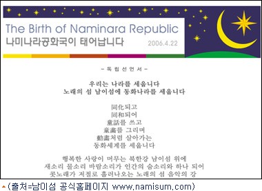 남이섬은 1일 오전 나미공화국을 선포하고 "우리는 동화를 그리며 동화처럼 살아가는 동화세계를 남이섬에 만듭니다."라는 독립선언문도 채택했다.