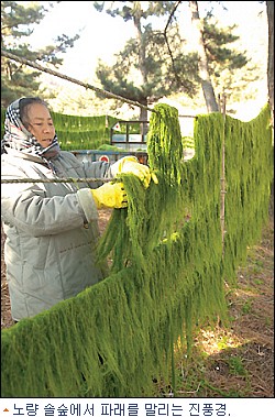 금남면 면소재지이기도 한 노량은 남해대교로도 유명하다. 다리 아래쪽 갯벌에는 굴을 까는 주민들의 손길이 봄을 부른다. 여기서는 파래를 말리는 방법이 두 가지다. 하나는 해안에서 바닷바람으로, 또 하나는 산 위 소나무숲에서 솔바람으로 말리는 것이다. 소나무숲 속에서 파래를 말리던 66세의 할머니는 ''''피부가 좋으십니다''''하는 말에 ''''내가 한때 화장품 장사도 안 했습니꺼'''' 하셨다.