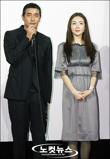 3일 오후 서울 삼성동 메가박스에서 열린 영화 ''연리지''(감독 김성중 · 제작 화이트시네마) 기자시사회에서 극중 운명적 사랑을 나누는 주인공 ''민수''와 ''혜원''을 각각 열연한 조한선과 최지우가 무대에 올라 소감을 밝히고 있다.