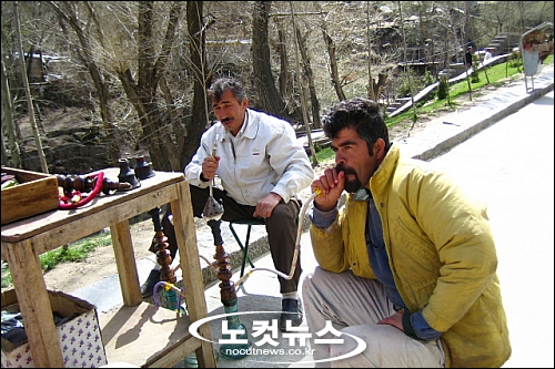 이란의 남성들은 깔때기처럼 긴 펌프 도구에 과일향 등을 넣어 연기로 뿜어내는 ''''물담배''''를 즐긴다.