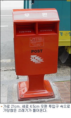 이들은 이구동성으로 쓰레기 우범(?) 우체통 지역으로 부산역과 부산진역을 꼽았다. 오고 가는 사람이 많다보니 쓰레기 종류도 화려하다. 정류장과 택시 승강장, 지하철 출입구 주변 우체통도 어김없이 손을 탄다. 이런 곳의 우체통에선 기본 쓰레기는 물론이고 가끔은 가당찮은 쓰레기도 나온다. 가로 21㎝, 세로 4.5㎝의 우편투입구를 통과했다고 생각하기 힘든 빈 캔과 벽돌조각, 가방 등이 우체통을 당혹하게 하는 주범들이다.