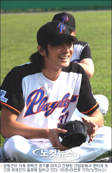 14일 오후 경기도 이천 건국대학교 이종범야구장에서 열린 영화배우들의 야구팀 플레이보이스의 경기에서 취재진의 가장 큰 관심을 끈 선수는 장동건.