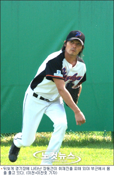 공형진, 현빈, 주진모, 안길강 등과 함께 백팀으로 자체 청백전에 나선 장동건은 마지막회인 7회 마무리 투수로 마운드에 올랐다.