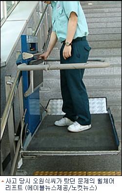 지난 4월 30일 오전 9시50분께 서울 청량리 지하철 1호선 회기역에서 지체장애인 2급 오원식씨가 전동스쿠터로 휠체어리프트를 이용하다가 추락해 갈비뼈 등이 부러지는 중상을 입고 상계동 을지병원에 입원 가료 중이다.