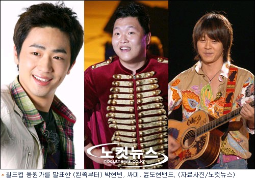 랩 응원가 ''We Are The One''을 발표한 싸이도 응원곡의 중심으로 발돋움하고 있다. 기본 록 음악에 꽹과리, 태평소, 가야금 등 한국적인 음악을 덧씌움으로써 가장 한국적인 응원곡이라는 평가를 받고 있는 이 노래는 뮤직비디오의 선전속에 최근 젊은층의 지지를 이끌어내고 있다. 그의 장기는 싸이만의 열정적인 무대, 시원한 분위기의 댄서들과 펼치는 그의 무대는 랩음악의 진수를 느끼게하며 월드컵의 새로운 재미를 이끌어내고 있다.