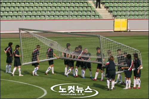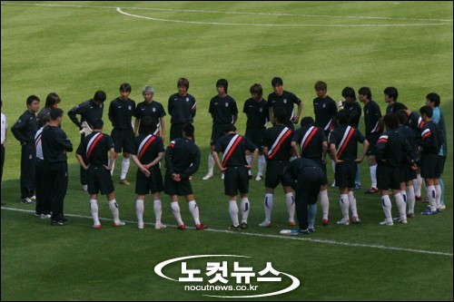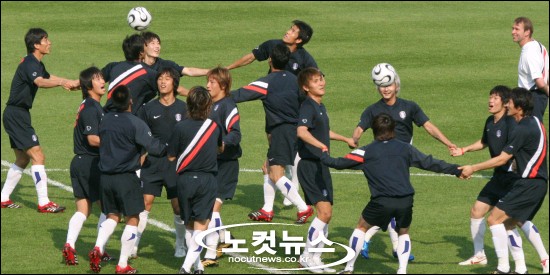 ↑ ''둥글게 둥글게, 빙글빙글 돌아가면 공을 줍시다?''그라운드를 돌며 가볍게 러닝을 한 선수들이 몸풀기에 들어갔다. 골키퍼 3명을 제외한 20명의 태극전사들은 5명씩 4조로 나뉘어 패싱 훈련을 했다. 선수들은 손을 잡은 채 헤딩을 이용해 볼을 연결하는, ''게임같은 훈련''을 하는 동안 연신 웃어댔다.