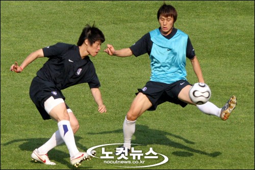 ↑ ''미니게임도 월드컵 경기처럼''미니게임에서는 실전 경기를 방불케 할 만큼 치열한 경기가 펼쳐졌다. 백지훈과 볼을 다투는 박지성(왼쪽)이 표정도 예사롭지 않다. 5대5 미니게임 후 아드보카트 감독은 미드필더들에게만 3대3 미니게임을 주문하며 미드필드에서의 압박을 위한 훈련에 집중했다.