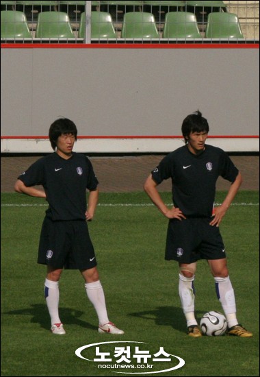 ↑ ''쉴 때도 시선은 팀가이스트에''박지성(왼쪽)과 조재진이 동료들이 5대5 미니게임을 하는 동안 잠시 숨을 돌리고 있다. 쉬면서도 눈은 미니게임을 뛰고 있는 선수들의 움직임을 따라가고 있다.