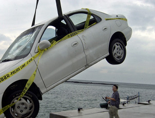 2003년 7월 제주도 조천읍에서 일가족이 함께 바다로 투신 자살한 차량이 건져지고 있다.(자료사진)