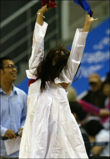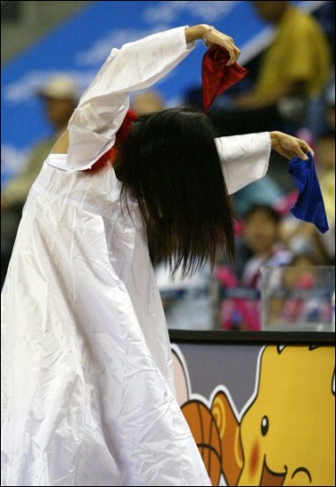 4일 용인실내체육관에서 벌어진 여자 프로농구 신세계와 삼성생명의 경기에서 치어리더가 하얀 소복 차림으로 관객들에게 납량 치어리딩을 선보이고 있다.