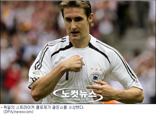 이번 월드컵에서 개인통산 5골을 터트린 클로제는 10일 이탈리아-프랑스 결승전에서 득점왕 경쟁에 나섰던 프랑스의 티에리 앙리(3골)가 골사냥에 실패하면서 골든슈의 주인공이 됐다.