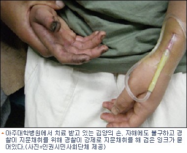 인권단체들은 "김양이 경찰의 지문 채취에 항의하던 중 자신의 열손가락을 병뚜껑과 이빨로 자해했지만 경찰은 김양을 병원으로 옮기지 않고 지문채취를 강행했다"고 주장했다.