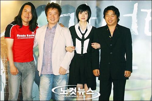 24일 오후 서울 용산 cgv에서 열린 영화 ''각설탕''(감독 이환경·제작 싸이더스 FNH)의 언론배급 시사회에서 영화의 주역들이 다정하게 포즈를 취하고 있다. (왼쪽부터)이정학 프로듀서, 이환경 감독, 임수정, 박은수.