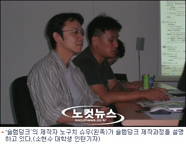 3일 오후 서울 홍대 앞 어뮤즈먼트 미디어 아트스쿨에서 열린 ''''슬램덩크 제작자 초청 세미나''''에서 ''''슬램덩크'''' 의 공동제작자인 노구치 슈우(40)는 :''''슬램덩크''''의 최초 주인공은 ''''강백호''''가 아닌 ''''서태웅''''이었다"고 밝혔다.