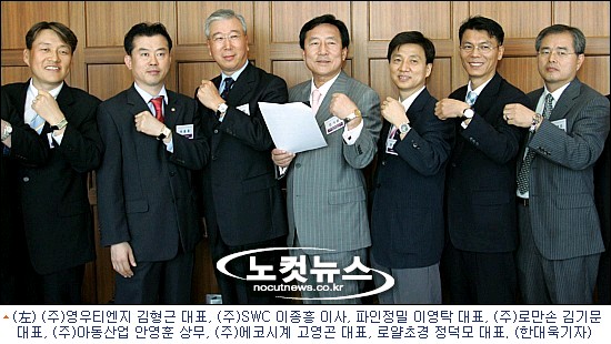 이날 참석한 (왼쪽부터) (주)영우티엔지 김형근 대표, (주)SWC 이종흥 이사, 파인정밀 이영탁 대표, (주)로만손 김기문 대표, (주)아동산업 안영훈 상무, (주)에코시계 고영곤 대표, 로얄초경 정덕모 대표는 해외에서 인정받고 있는 자사의 시계를 직접 차고 기념촬영을 하는 등 브랜드에 대한 자부심을 드러내기도 했다.