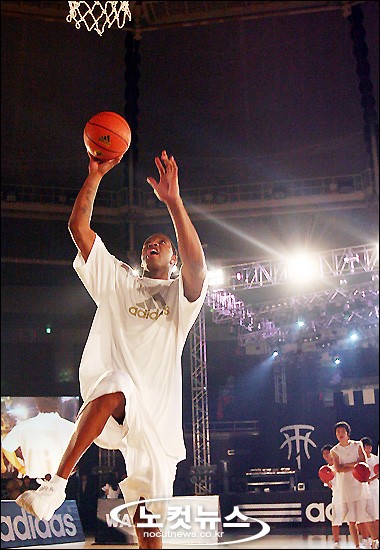 아시아 투어를 위해 한국을 찾은 NBA 득점왕 출신의 스타 트레이시 맥그레이디(휴스턴 로케츠)가 25일 오후 서울 올림픽공원 펜싱경기장에서 연 농구클리닉에 참석한 학생들 앞에서 덩크슛을 선보이기 위해 뛰어 오르고 있다.