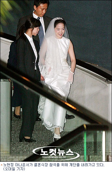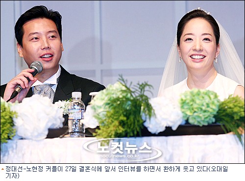 이날 오전 11시 결혼식을 올린 노현정 아나운서는 일치감치 하루를 시작했다. 노 아나운서는 철저한 경호를 받으며 오전 5시 경호원 4명의 호위 속에 서울 한남동 그랜드 하얏트 호텔 인근에 위치한 미용실을 찾아 신부화장을 4시간여동안 받았다. 신랑 정대선 씨는 오전 6시40분께 하얀색 티셔츠에 반바지 차림으로 미용실에 들어서 함께 결혼식을 위한 준비를 시작했다.