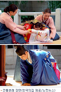 익살스러운 매파가 등장, 혼사를 의논하는 의혼으로 시작되는 전통혼례는 신랑이 백년해로의 의미로 기러기를 드리는 전안례(奠雁禮), 신랑신부가 첫 맞절을 교환하는 교배례(交拜禮), 부부가 되었음을 의미하는 합근례(合巹禮 )등으로 진행된다.