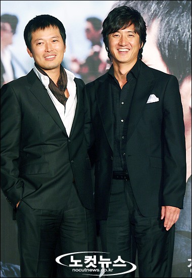 25일 저녁 서울 발산동 메이필드호텔에서 열린 영화 ''거룩한 계보''(감독 장진· 제작 KnJ엔터테인먼트&필름있수다) 제작보고회에서 함께 열연한 정재영(왼쪽)과 정준호가 다정하게 포즈를 취하고 있다.