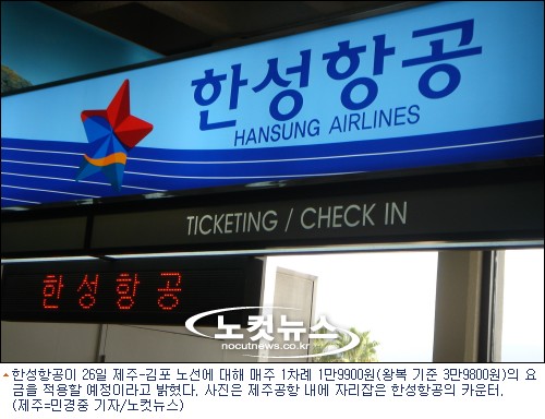 한성항공은 제주-김포노선 취항을 기념해 기존의 제주-청주 노선뿐만 아니라 제주-김포 노선에 대해 매주 1차례 1만9900원(왕복 기준 3만9800원)의 요금을 적용한다고 26일 밝혔다.
