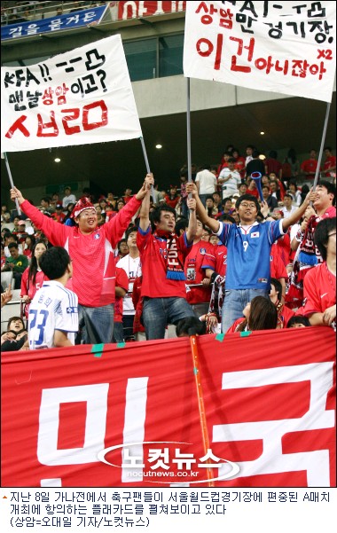 지난 가나전에서는 "지방팬 홀대를 그만하라"는 피켓을 든 팬들도 관중석에 등장했다.