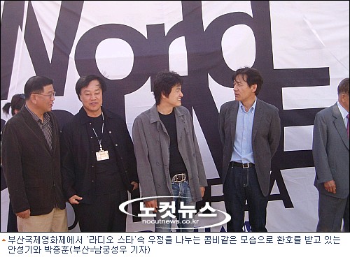 13일 오전 100만을 돌파했다는 소식이 전해질 무렵 휴먼드라마 ''라디오 스타''의 두 주인공 안성기와 박중훈은 부산국제영화제의 한 야외 행사에 김동호 집행위원장과 함께 부산 씨네필 들을 만나고 있었다.