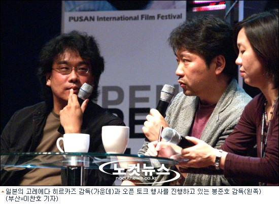 이날 봉준호 감독과 이야기를 나눈 고레에다 히르카즈 감독은 독특한 시대극을 표방하는 영화 ''''하나''''의 초청으로 부산국제영화제를 방문했다.