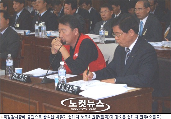 이날 국정감사 자리에는 현대자동차 울산공장 강호돈 전무와 박유기 노조위원장이 증인으로 출석했다.