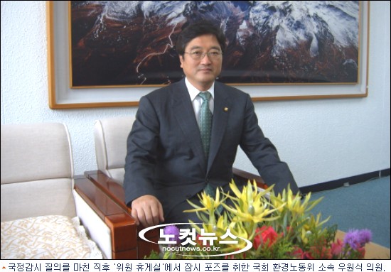 <우원식 의원 미니인터뷰>우원식>국정감사 질의를 마친 직후 감사장 바로 옆 ''위원 휴게실''에서 잠시 통화하고 있던 우원식 의원을 만났다. 그는 같은 당 소속 김종률, 제종길 의원의 질문시간 절반씩(5분간씩)을 양보받아 모두 20여 분에 걸쳐 송곳날 같은 신문 공세를 펼쳤다.