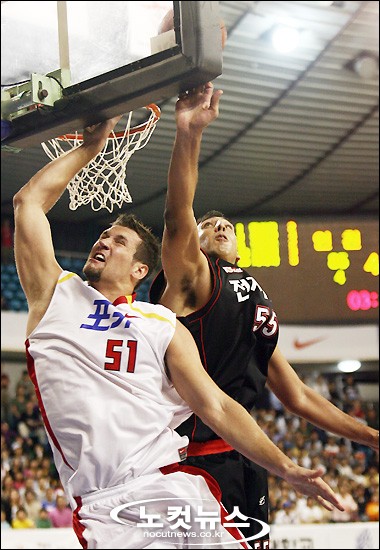 20일 오후 대구실내체육관에서 열린 ''2006~07 현대모비스 프로농구'' 정규리그 대구 오리온스-인천 전자랜드전에서 인천의 용병 아담 파라다가 대구 용병 제러드 호먼의 골밑슛을 몸을 던져 막아내고 있다.