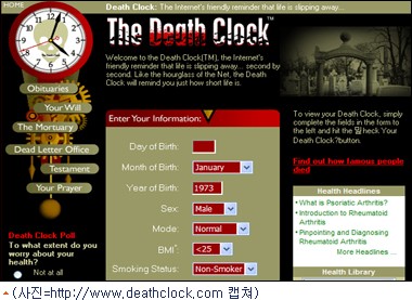 29일 로이터통신에 따르면 이 별난 웹사이트(http://www.deathclock.com)는 태어난 생년월일을 입력하고 흡연여부, 신장, 체중등을 입력하면 바로 팝업광고가 뜨면서 사망추정시간까지의 남은 시간을 측정하기 시작한다. 이 사이트에 들어가면 가족이나 연인, 친구에게 자기가 죽고 난 뒤 유언까지 남길 수 있다.