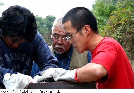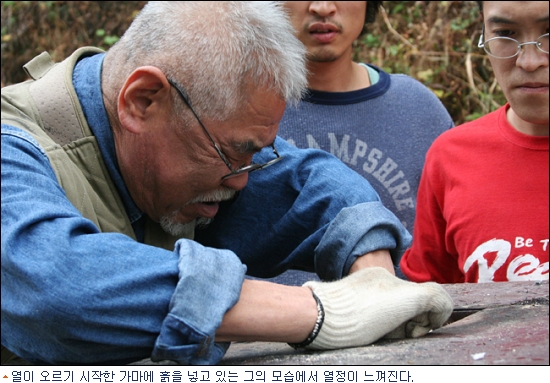 흙을 집어 넣을 차례가 되자 그의 눈빛이 번뜩인다. 불과의 거리, 방향 등을 고려해 천천히 조심스럽게 흙을 가마에 넣는 과정. 그만 흙을 내려뜨리고 만 제자에게 매서운 눈빛이 향한다. 그리고는 조용히 가마 옆을 지킨다. 작품을 진행하는 동안 사색의 시간을 많이 갖는다. 진지한 표정과 눈빛으로 가마를 지켜본다.