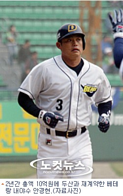 안경현은 한국야구위원회(KBO)가 FA(자유계약선수)들을 공시한 첫 날인 3일 전 소속팀 두산과 총액 10억원에 재계약했다. 2년 기간에 계약금과 연봉 각각 3억원, 옵션 1억원의 조건이다.