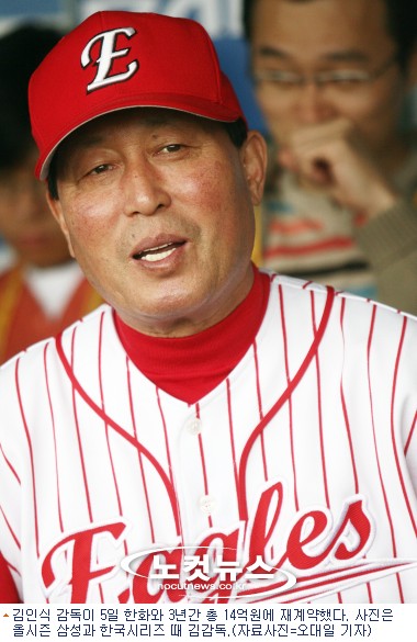 ''국민감독'' 김인식 감독(59)이 한화 이글스와 3년 계약금과 연봉 3억 5,000만원 씩 총 14억원에 재계약했다.