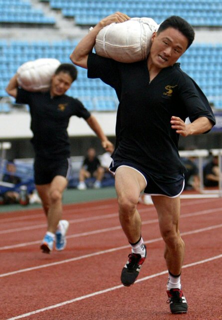 8일 대전시 중구 한밭운동장에서 충남지방경찰청 특공대원들이 40kg 무게의 모래주머니를 들고 100m달리기를 하며 체력검정을 받고 있다. 2004.7.8 (대전=연합뉴스)