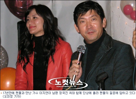 이 자리에는 이지연의 남편 정국진 씨도 참석했다. 정 씨는 "아내가 활동을 그만하고 우울증을 겪을 정도로 심적으로 고민을 많이 했다"며 "팬들을 통해 어려움을 극복했다"고 팬들에게 감사 인사를 했다.