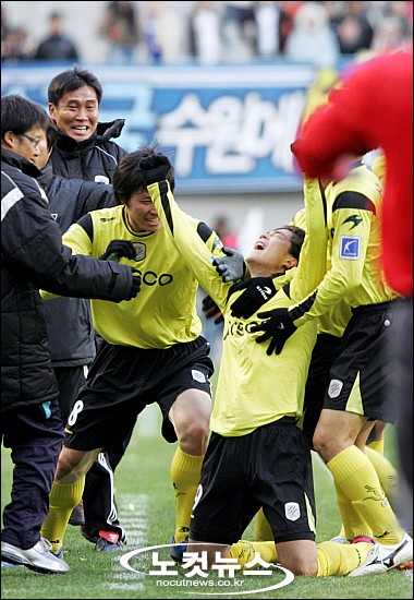 3일 오후 서울 상암 월드컵경기장에서 열린 2006 하나은행 FA컵 전국축구선수권대회 결승전 전남 드래곤즈 대 수원 삼성 블루윙즈의 경기에서 후반 11분 송정현이 결승골을 넣은 뒤 기뻐하고 있다.