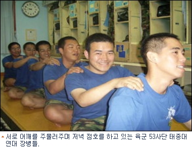 서로 어깨를 주물러주며 저녁 점호를 하고 있는 육군 53사단 태종대연대 장병들. 월요일은 자신과 전우의 마음그리기다. 평소 어렵게 느껴지던 선임병의 마음을 그림으로 표현하다 보면 폭소가 쏟아지기도 하고 금세 친한 형제 사이로 변한다고. 화요일에는 한 명 이상 칭찬하기, 수요일에는 분대 신문 만들기, 목요일에는 자화상 그리기, 금요일에는 공감하기, 토요일에는 역할 연기, 일요일에는 독서 토론이 진행된다.