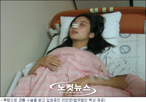 1일 오전 이민영 측 변호인인 김재철 변호사(법무법인 백상)는 이메일을 통해 "이민영 씨는 2006년 12월31일 현재, 폭행으로 인한 코뼈 접합수술을 받고 입원치료중인 상태"라며 병원에 링거를 맞고 얼굴이 폭행으로 인해 멍이 들어있는 이민영의 사진을 공개했다.