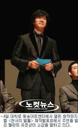유준상은 4일 대학로 동숭아트센터에서 열린 창작뮤지컬 ''천사의 발톱'' 제작발표회에서 "오랜만에 뮤지컬을 하게 됐는데 연기하면서 혼자 통곡할 정도로 감성을 끌어내는 작품이라 더욱 마음에 와닿았다"고 말했다.