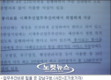 서울 강남구청이 업무추진비로 유흥업소에서 간담회를 여는가 하면 술집종업원들에게 봉사료 즉, 팁을 주기도 하는 등 주민들의 세금을 마치 제 돈처럼 마구 쓴 것으로 드러났다.