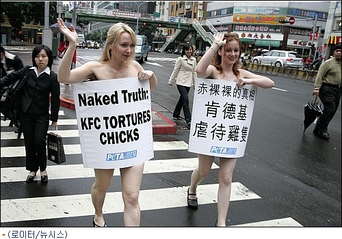 국제동물보호단체 ''동물을 윤리적으로 대하는 사람들(PETA)'' 회원들이 19일 대만 타이베이 시내의 패스트푸트 매장 앞에서 나체 시위를 벌이고 있다.