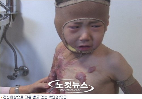 목욕을 하기 위해 따뜻한 물을 받는 아버지에게 뜨겁다며 소리치는 아이가 있다. 일반적으로 따뜻하다고 할 수 있는 온도에도 아이가 소스라치게 놀라는 이유는 생후 17개월에 있었던 끔찍한 사고 때문이다. 경북 경주의 할머니 댁에 놀러갔던 2004년 3월, 자다가 깬 민영(5)이는 일어나 문을 열고 밖으로 나갔다. 부엌과 연결되어 있던 문은 쉽게 열렸고, 아이는 그만 문 앞에 놓여있던 뜨거운 가마솥을 보지 못하고 빠져 온 몸의 70% 이상, 3도 열화상을 입게 되었다.