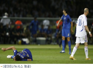 지난해 독일월드컵축구 결승에서 지네딘 지단(프랑스·은퇴)에게 박치기로 가슴을 맞았던 이탈리아 대표팀 수비수 마르코 마테라치(34·인터밀란)가 또 박치기를 당했다.